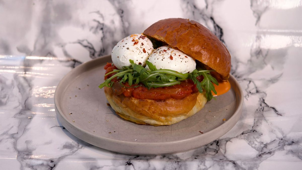 pošírovaná vejce, rajčatová omáčka s paprikami, bazalka, rukola, chilli, gochujang mayo, máslový brioš