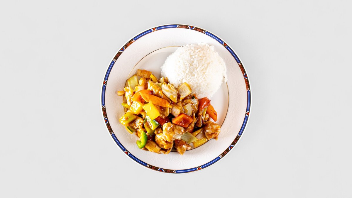 kachna, zelí, mrkev, bambus, černé houby, paprika, cibule (pikantní), rýže