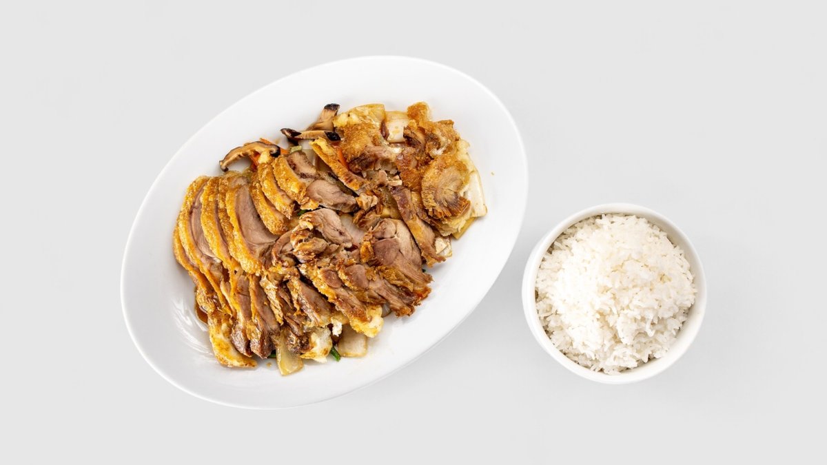 kachna, žampiony, zelí, mrkev, bambus, cibule, česnek, rýže