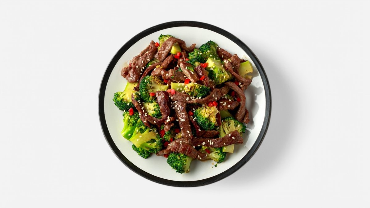restované hovězí maso s brokolicí, česnekem, sójovou chilli omáčkou, červenou cibulí, podávané s jasmínovou rýží