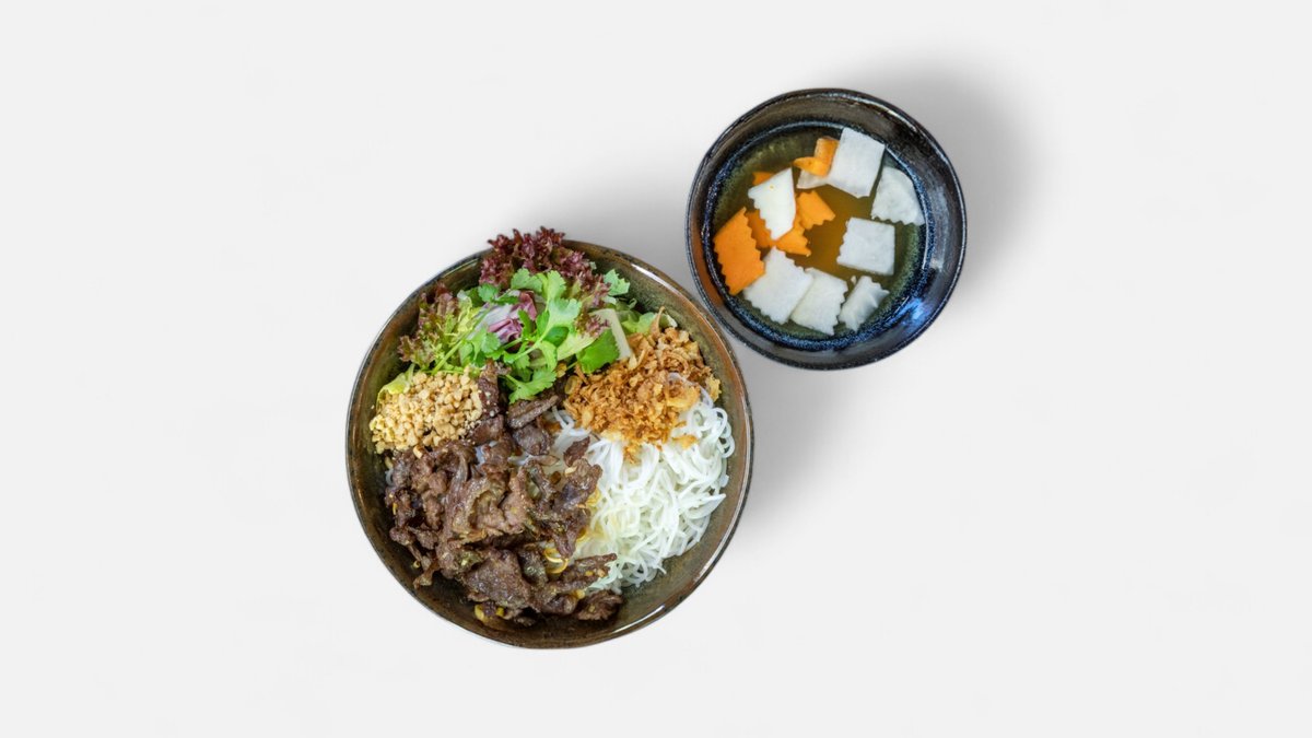 grilované hovězí maso, rýžové nudle, salát, arašídy, smažené cibulky, koriandr, omáčka