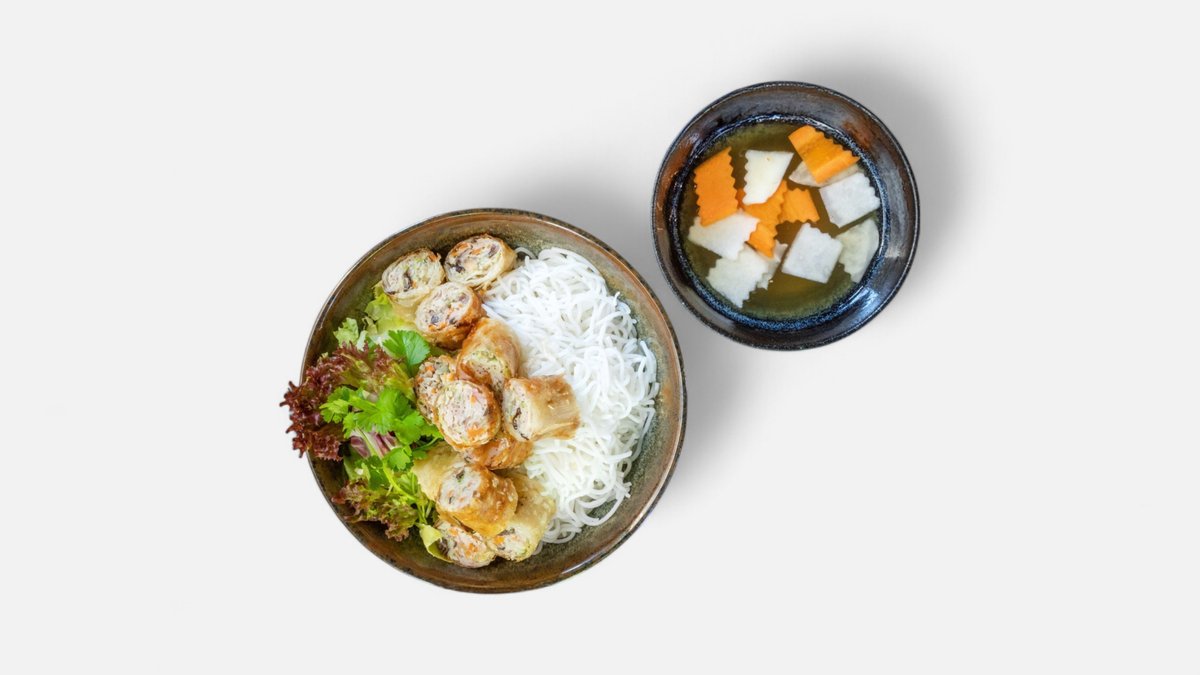 smažené závitky 3ks, rýžové nudle bun, salát, koriandr, omáčka