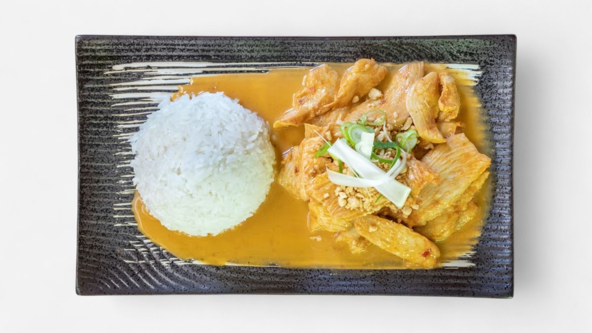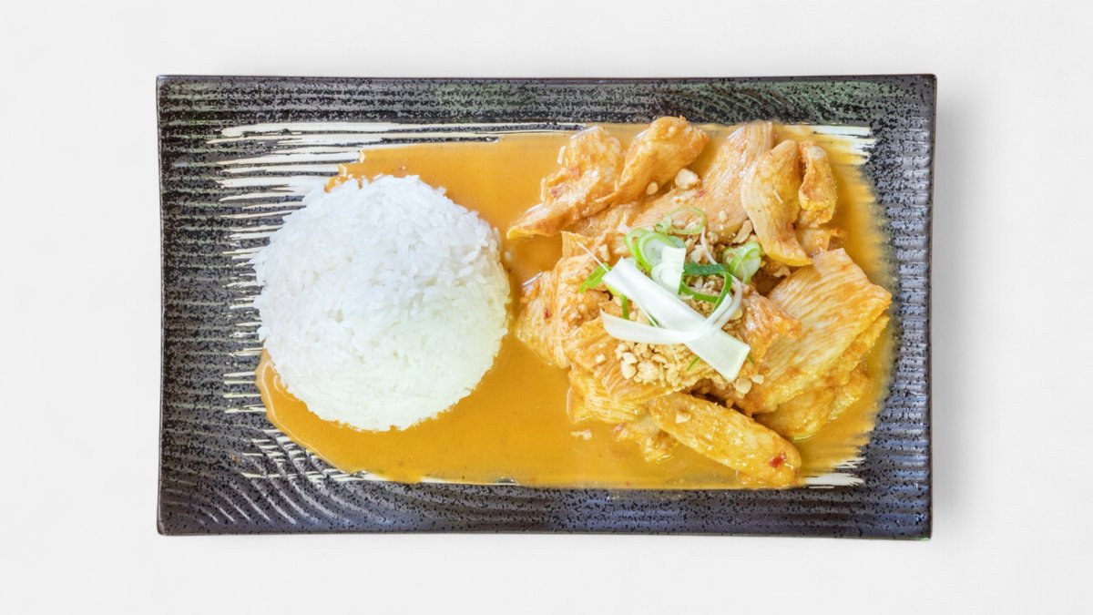 kuřecí maso, pikantní arašídová omáčka, cibule