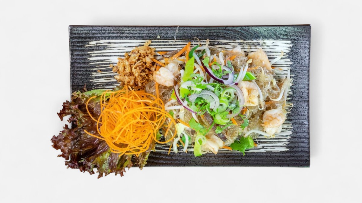nesmažené závitky s krevetami, salát, rýžové nudle