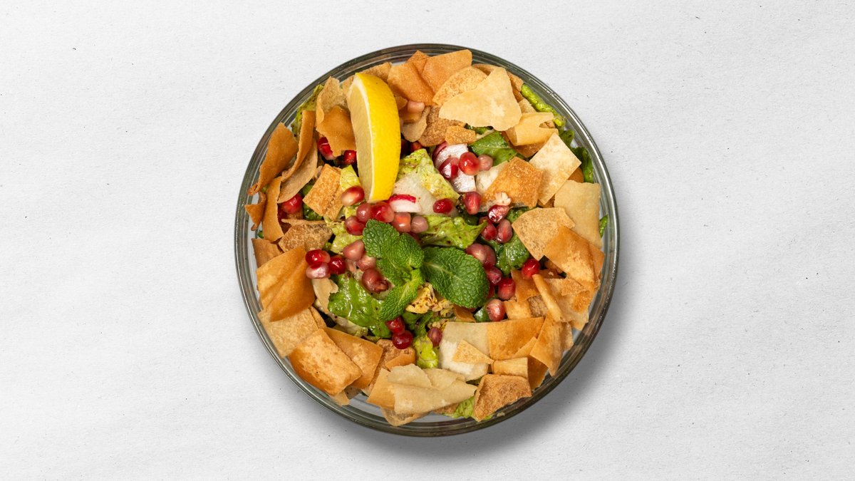 čerstvá míchaná zelenina se smaženým libanonským chlebem, citrónovou šťávou a olivovým olejem