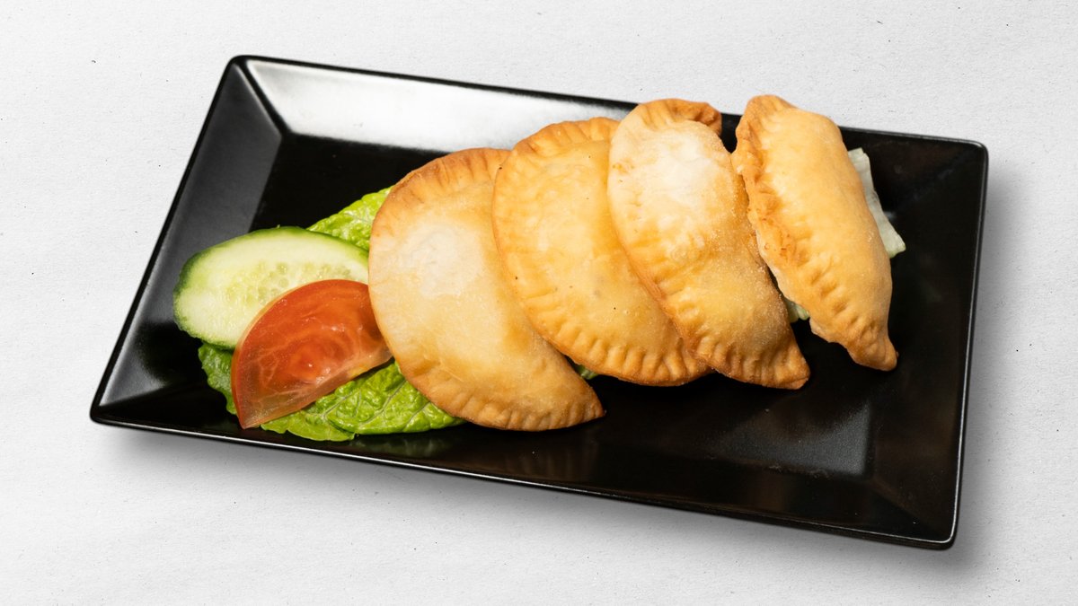 smažené taštičky plněné mletým jehněčím masem, cibulí a piniovými semínky