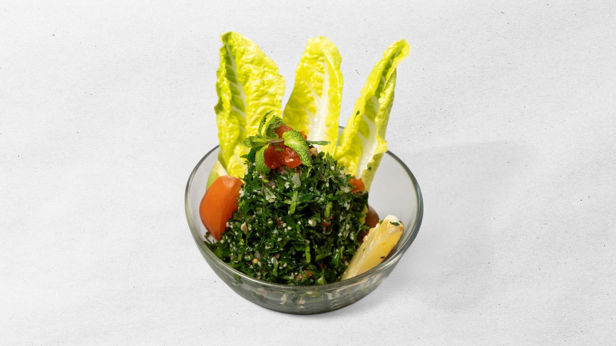 petrželkový salát s rajčaty, cibulí, mátou, drcenou pšenicí, citrónovou šťávou a olivovým olejem