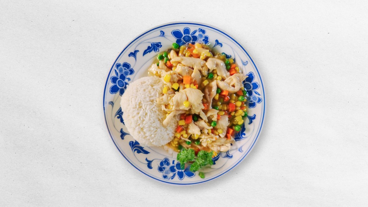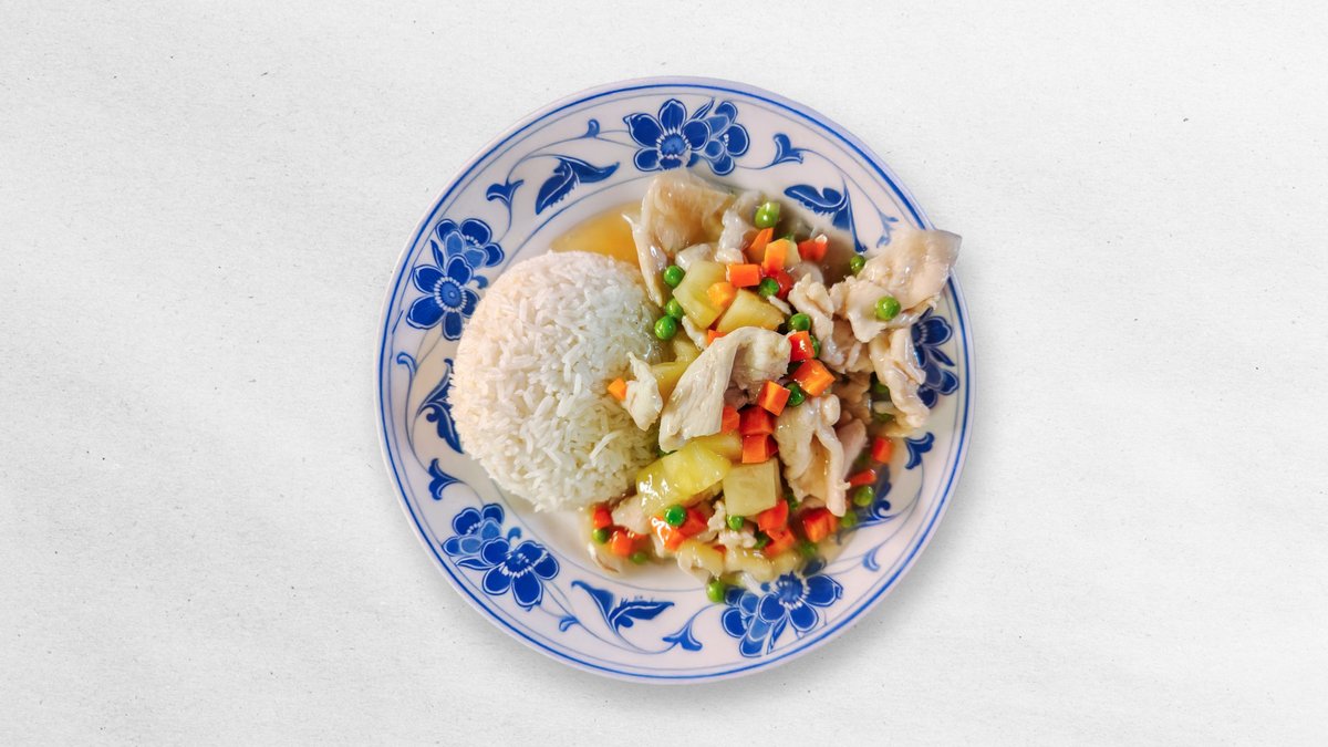 M21. Smažené voňavé a křehké kuře ve sladkokyselé omáčce s rýží