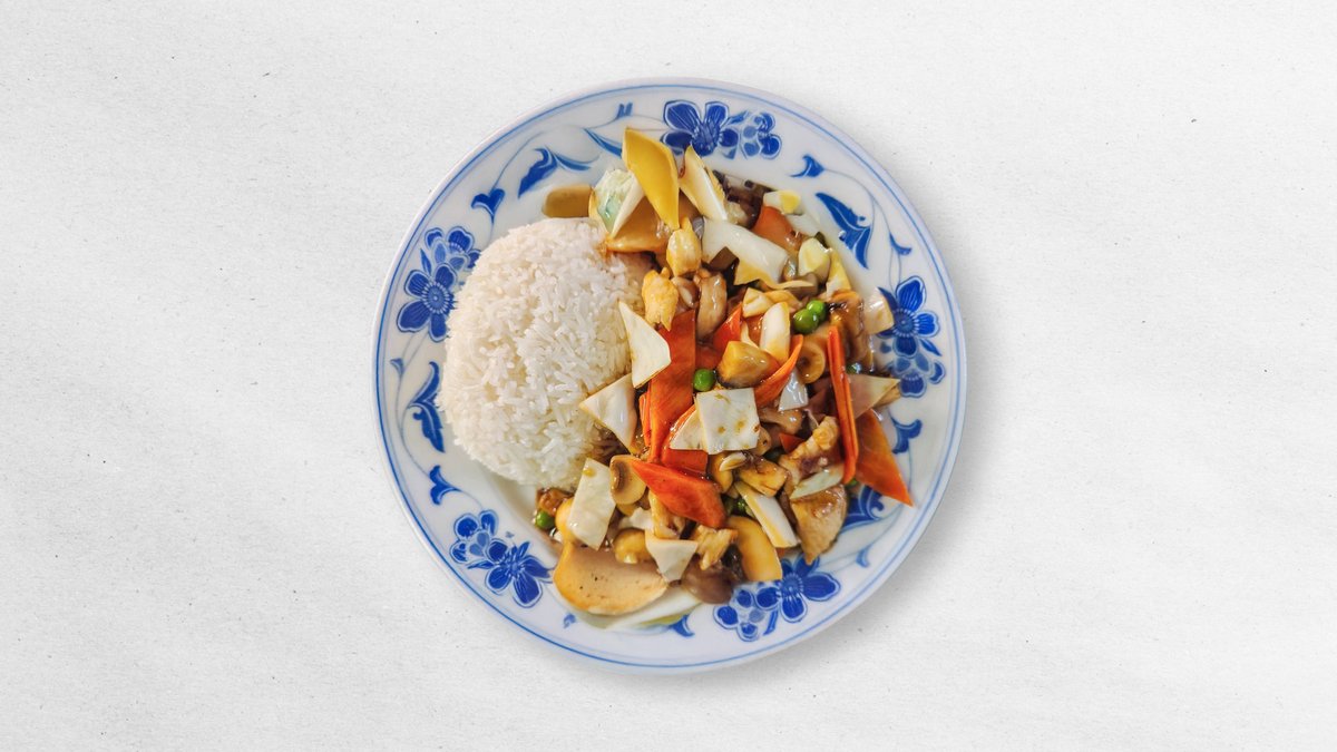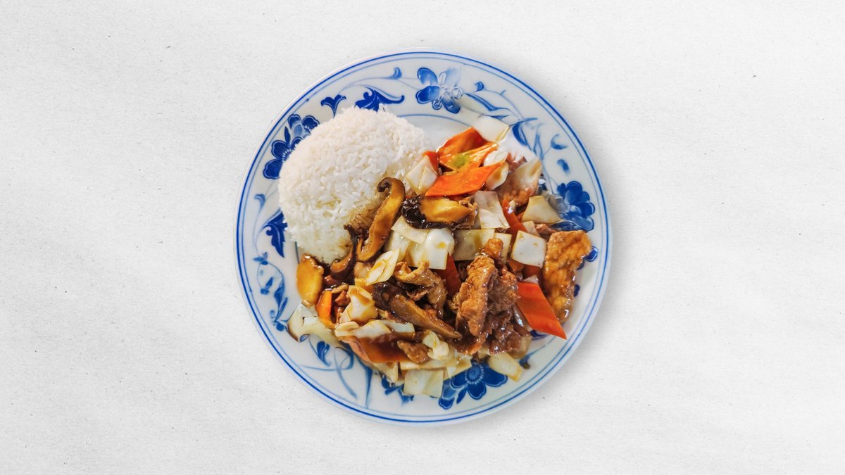 M21. Smažené voňavé a křehké kuře bambusem a houbami s rýží