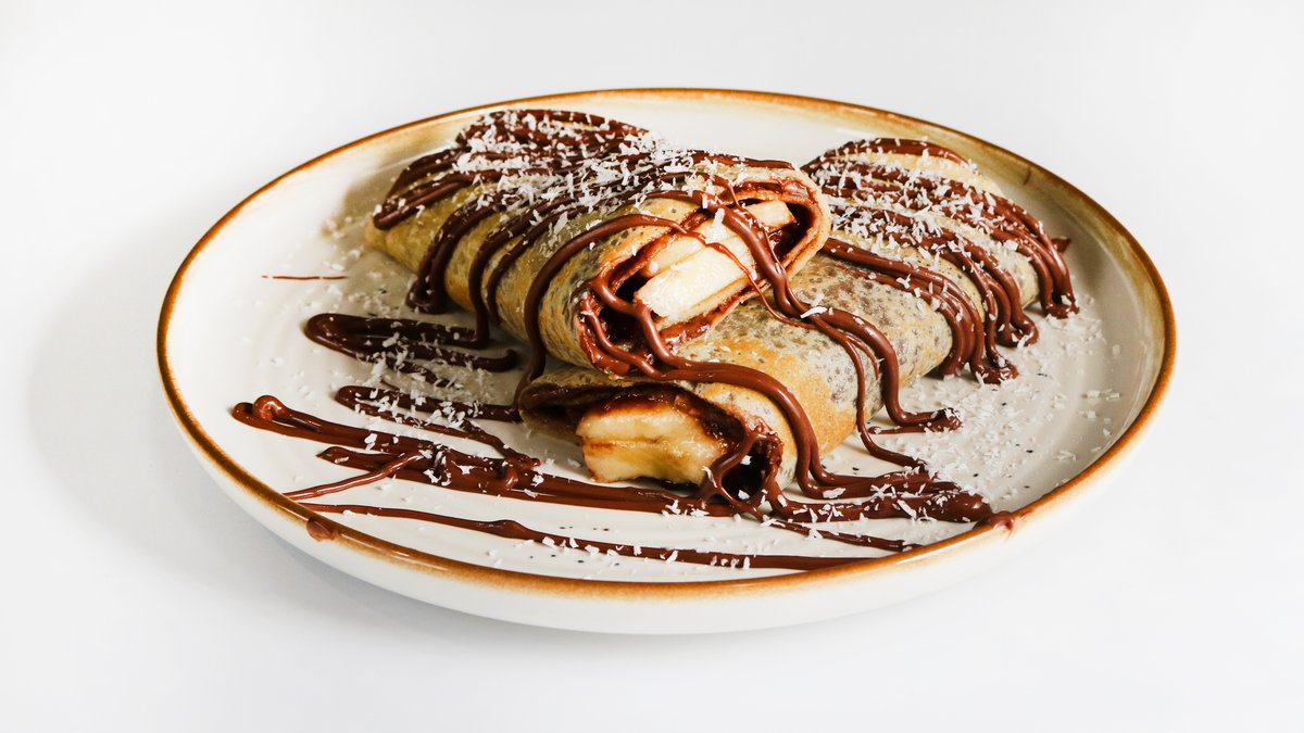 Lahodná pochoutka v podobě kombinace krémové Nutelly (a: 6, 7, 8), čerstvého banánu a jemného kokosu pro každého milovníka sladkého.