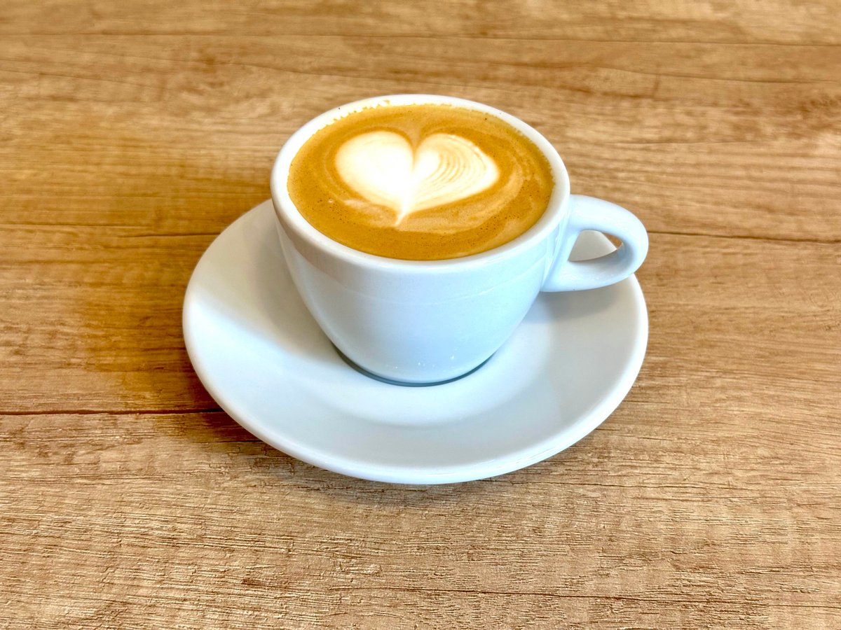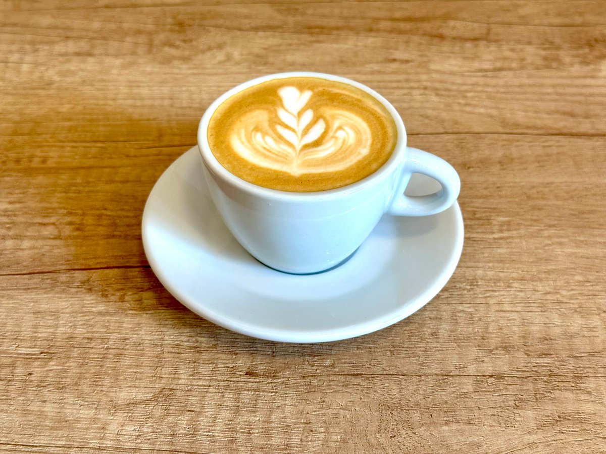 Espresso shot (30 ml) ze směsi Era od pražírny Doubleshot zalitý 150 ml napěněného plnotučného mléka.