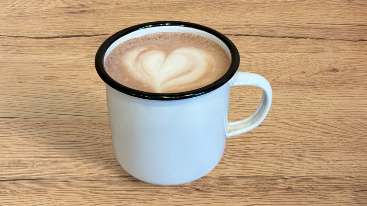 Dvojitý espresso shot (60 ml) ze směsi Era od pražírny Doubleshot zalitý 130 ml napěněného plnotučného mléka.