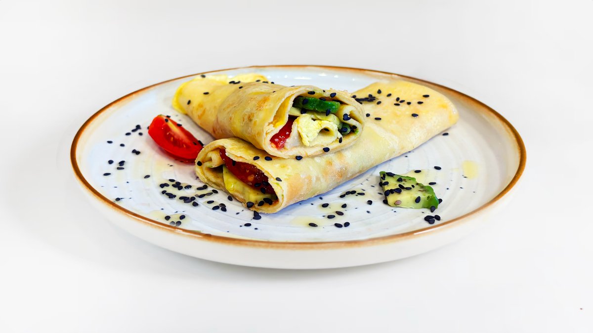 Lahodná palačinka v kombinaci s vaječnou omeletkou (a: 3), nakrájeným avokádem, cherry rajčaty a posypaný vynikajícím černým sezamem (a: 11).