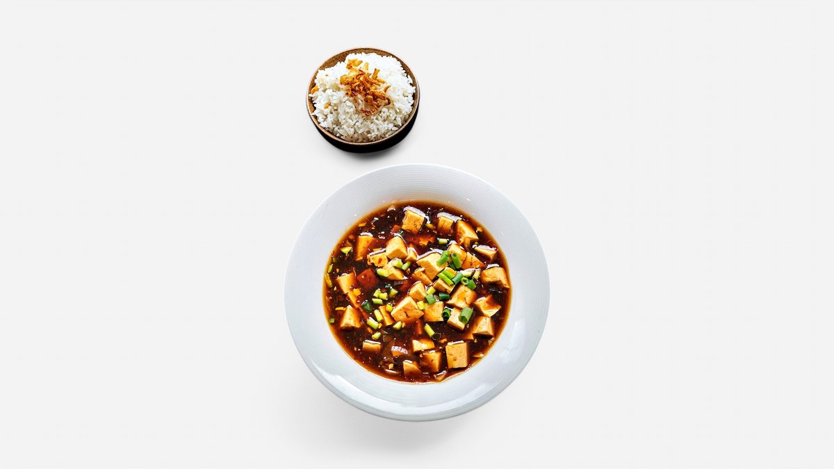 Sečuánský pokrm, dušené tofu v ostře pálivé omáčce, podávané s rýží Sichuan dish, tofu stew in a spicy sauce, served with jasmine rice