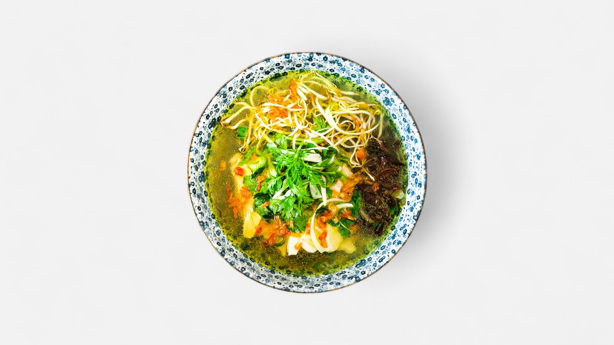 Polévka s kuřecím masem, skleněnými nudlemi, houbami shitake, mungo klíčky a čerstvými bylinkami Soup with chicken, glass noodles, shiitake mushrooms, mung sprouts and fresh herbs