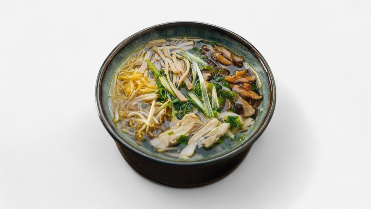 Vietnamská polévka s rýžovými nudlemi, kuřecím masem, vejcem, vepřovou fáší, shiitake a kikurage houbami Vietnamese soup with rice noodles, chicken meat, egg, pork ham, shiitake and kikurage mushrooms