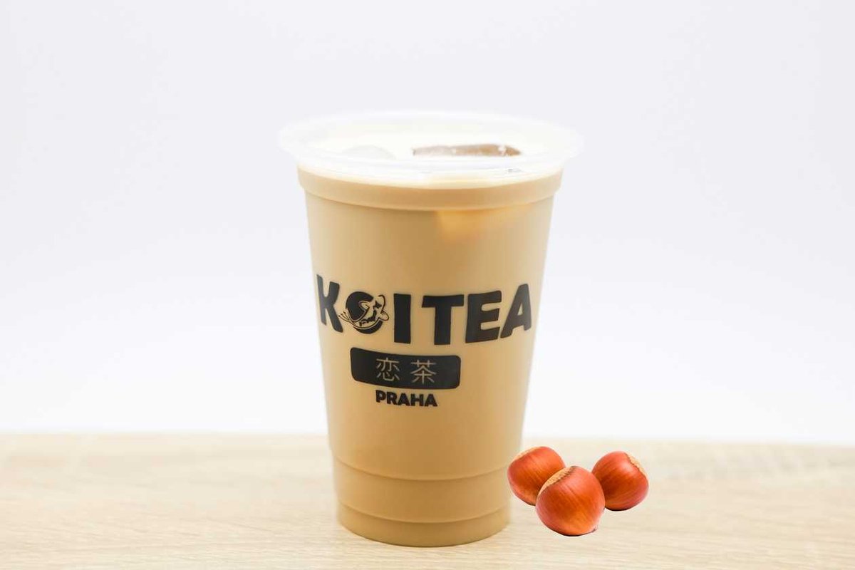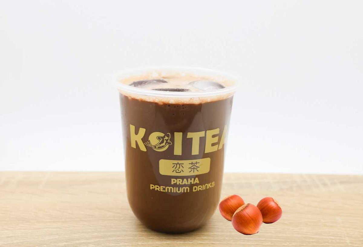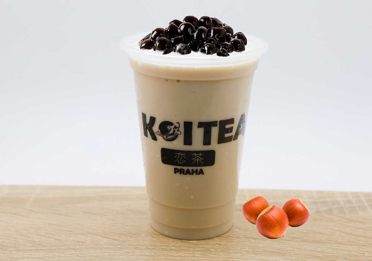 mléčný čaj s příchutí lískových oříšků - topping není v ceně