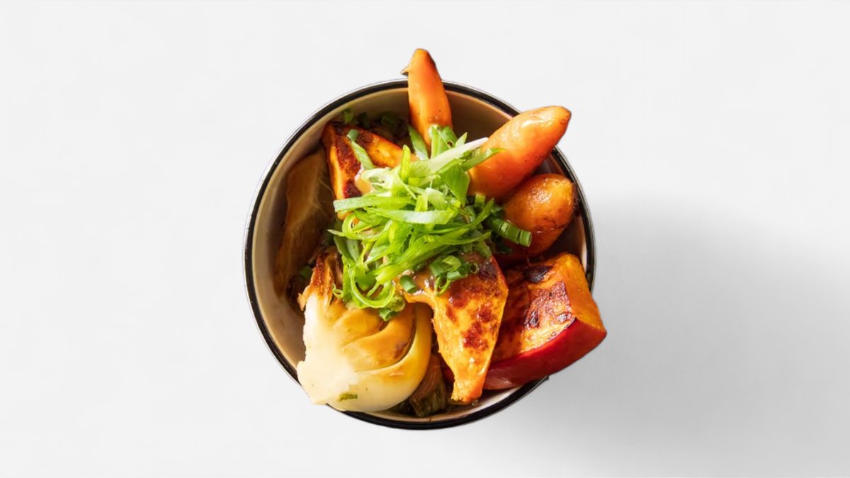 arašídy, jarní cibulka, semínkový chilli crunch, kewpie mayo, koriandr, jasmínová rýže