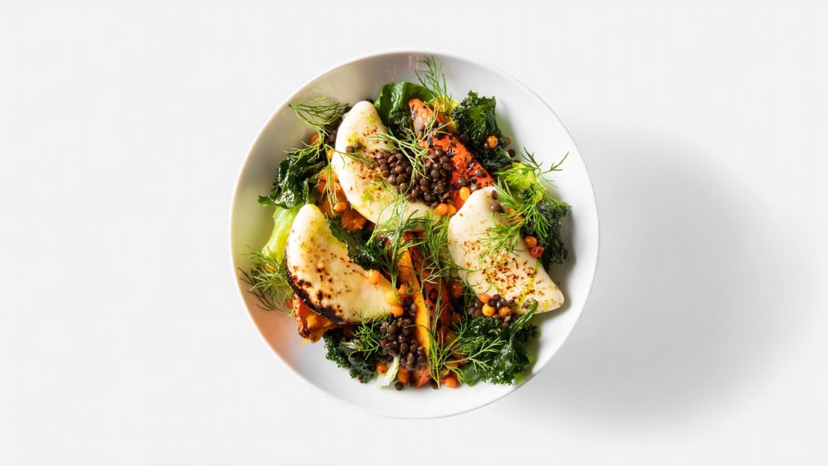 čerstvý sýr z farmy Diviš, listový salát, černá čočka beluga, kadeřávkové chipsy, rakytník, bylinky, vinaigrette
