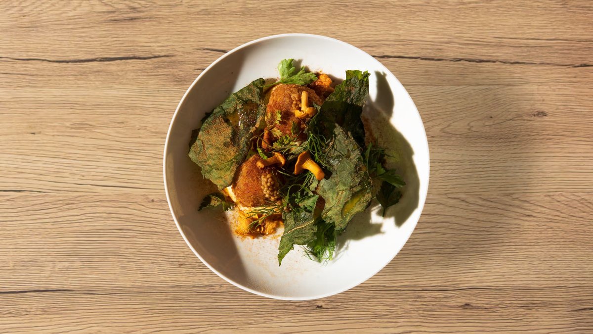 smažený tempeh z cizrny, čočky a hrachu, nakládaná řepa, romesco z pečených paprik, bylinky, sumac, topinka