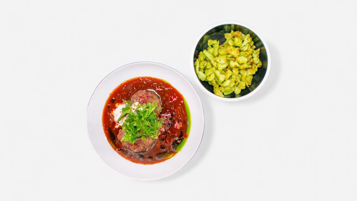 vepřová líčka, naše kimchi, zakysaná smetana, bylinkový salát, petrželové špecle