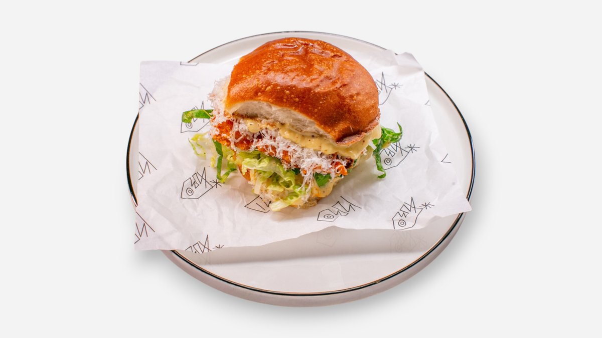 náš milk bun, smažené kuřecí prso, paprikový olej, caesar dresing, slaninový prach, římské listy, zrající sýr
