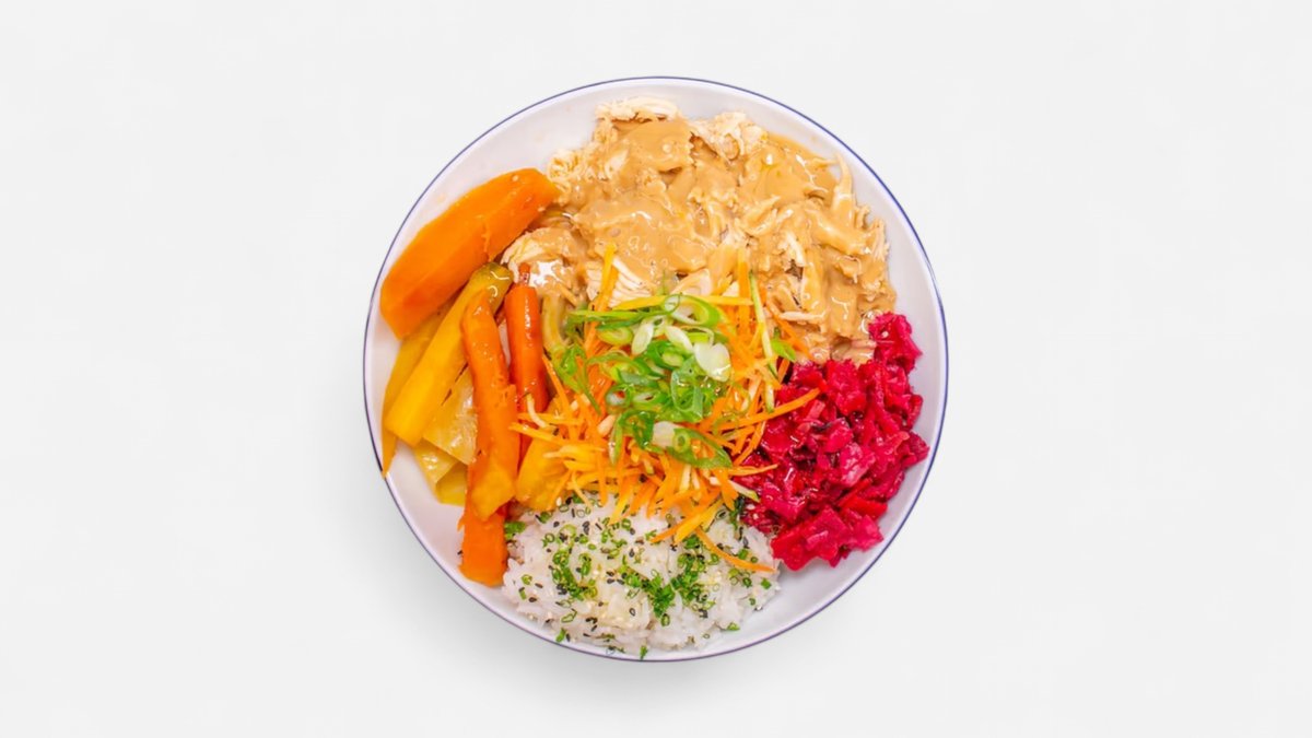 trhané kuřecí, jasmínová rýže, grilovaná sezónní zelenina, naše kimchi, emulze z hnědého másla se sojovkou, sezam, jarní cibulka