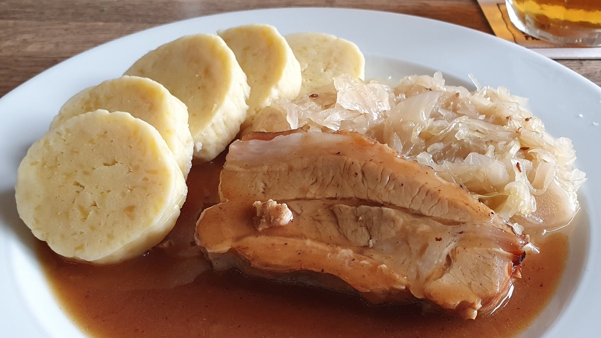 Pečený vepřový bůček po selsku, kysané zelí, bramborové knedlíky