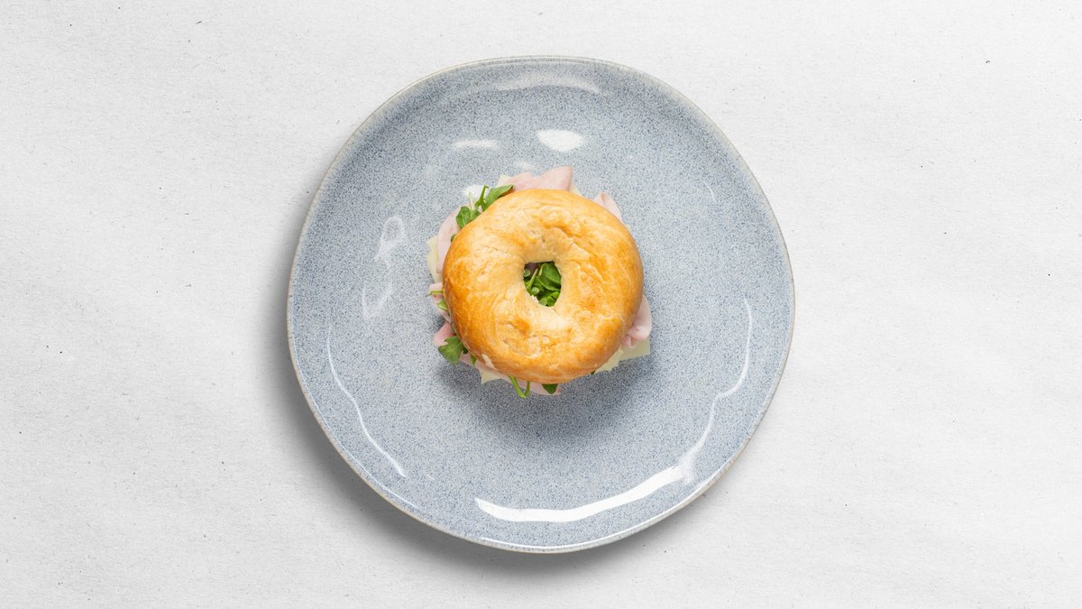 Bagel s míchaným vajíčkem, anglickou slaninou a čedarem