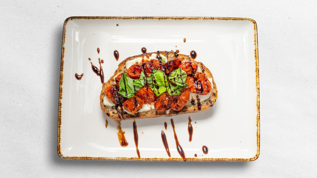 Opečený chléb s pečenými cherry rajčaty, burratou a čerstvou bazalkou