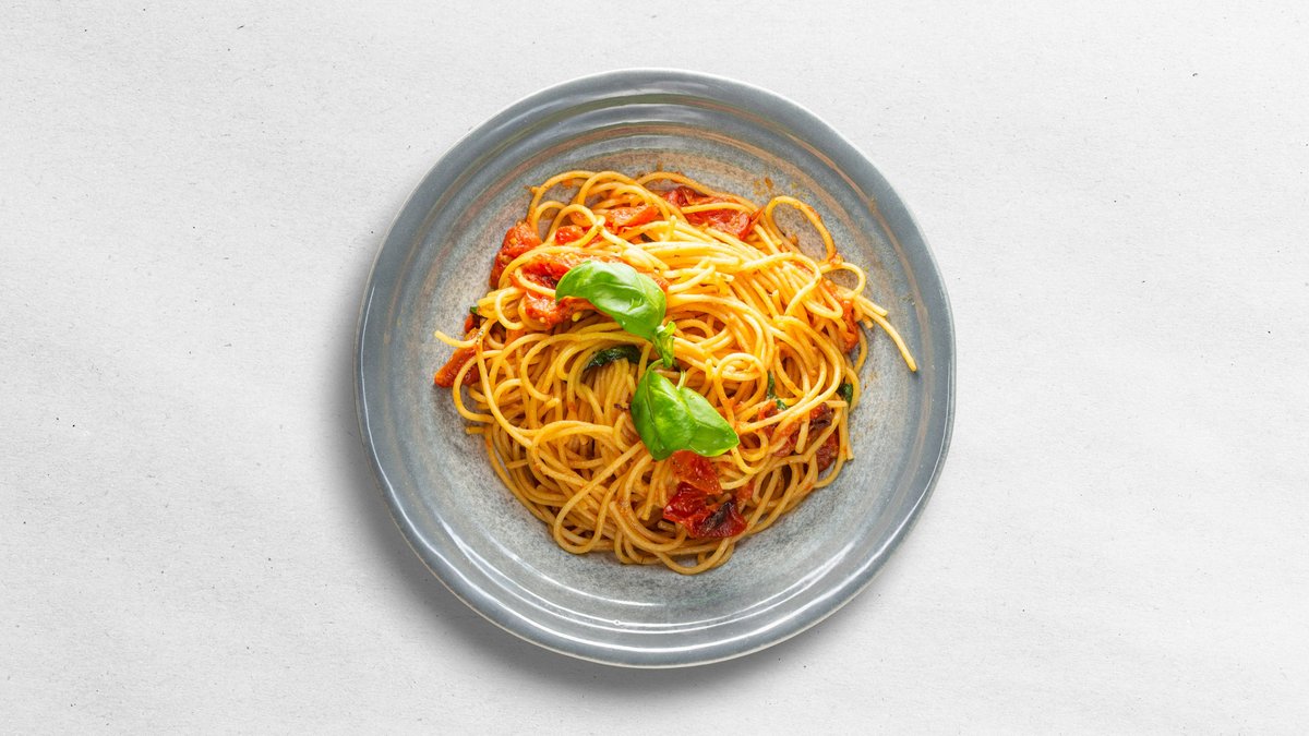 špagety, rajčatová omáčka, bazalka (možnost s burratou)
