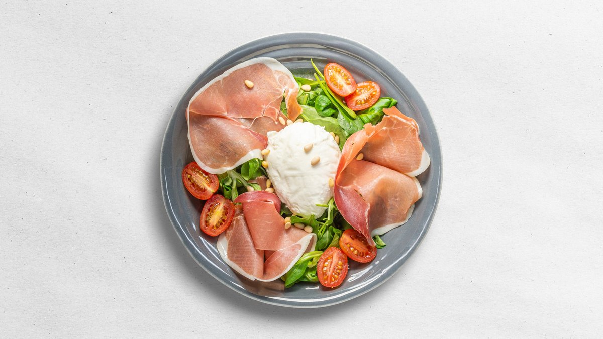 Salát s mozzarellou, prosciuttem a cherry rajčaty