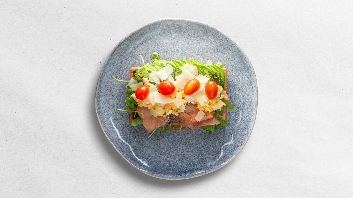 Opečený chléb s avokádem, vejcem, uzeným lososem a chia semínky