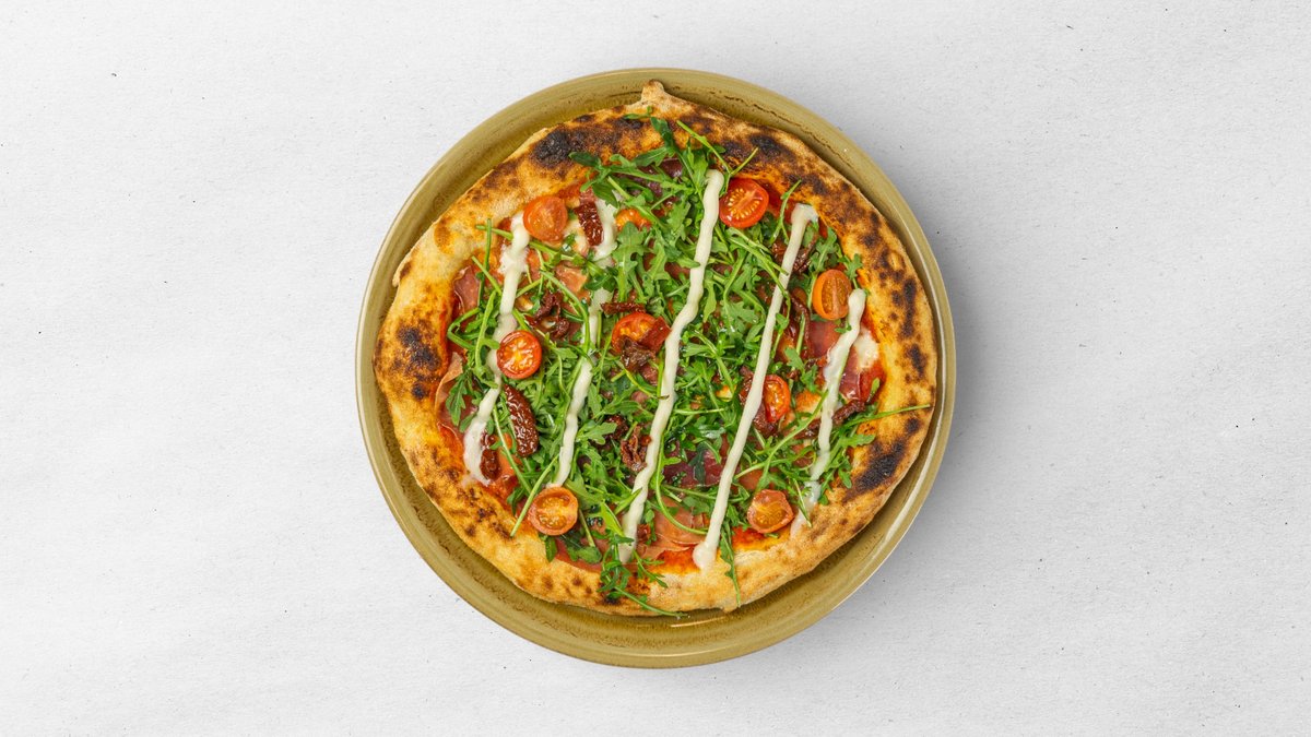 Rajčatová omáčka, sušená šunka, polosušená rajčata, rukola, smetanový krém z Parmigiano Reggiano
