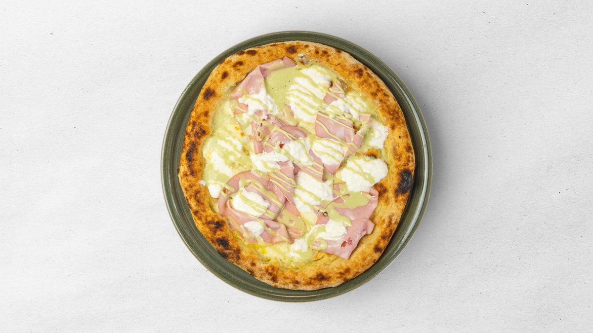Rajčatová omáčka, mozzarella fior di latte, žampiony, grilované artyčoky, olivy Taggiasca, vařené prosciutto