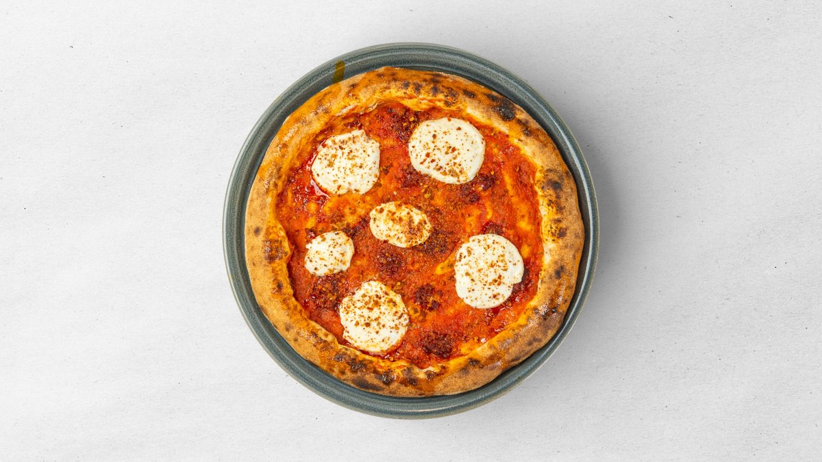 Rajčatová omáčka, mozzarella z buvolího mléka, 'nduja salám, 'nduja olej, 'nduja prášek, bazalka