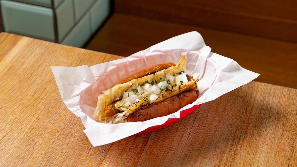 Hovězí párek, kysané zelí, grilovaný ementál, cibule, pažitka, louisianská remuláda