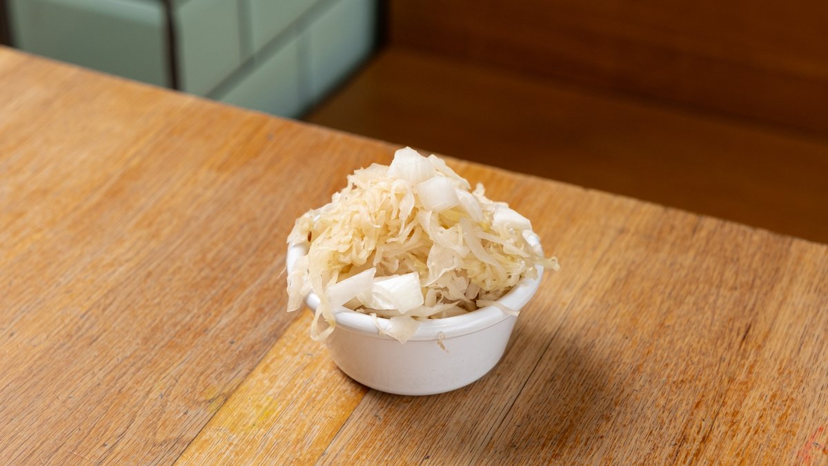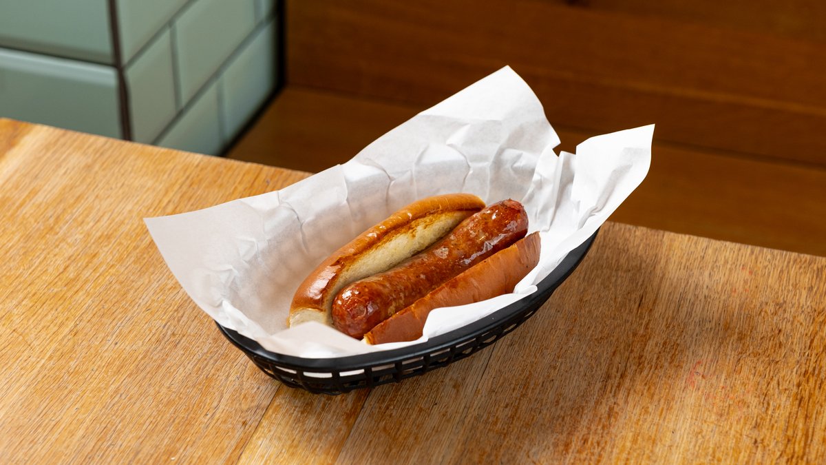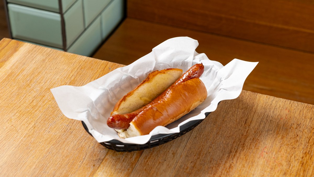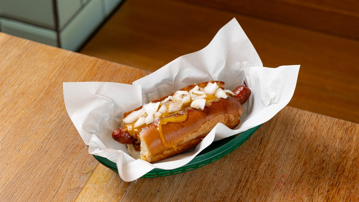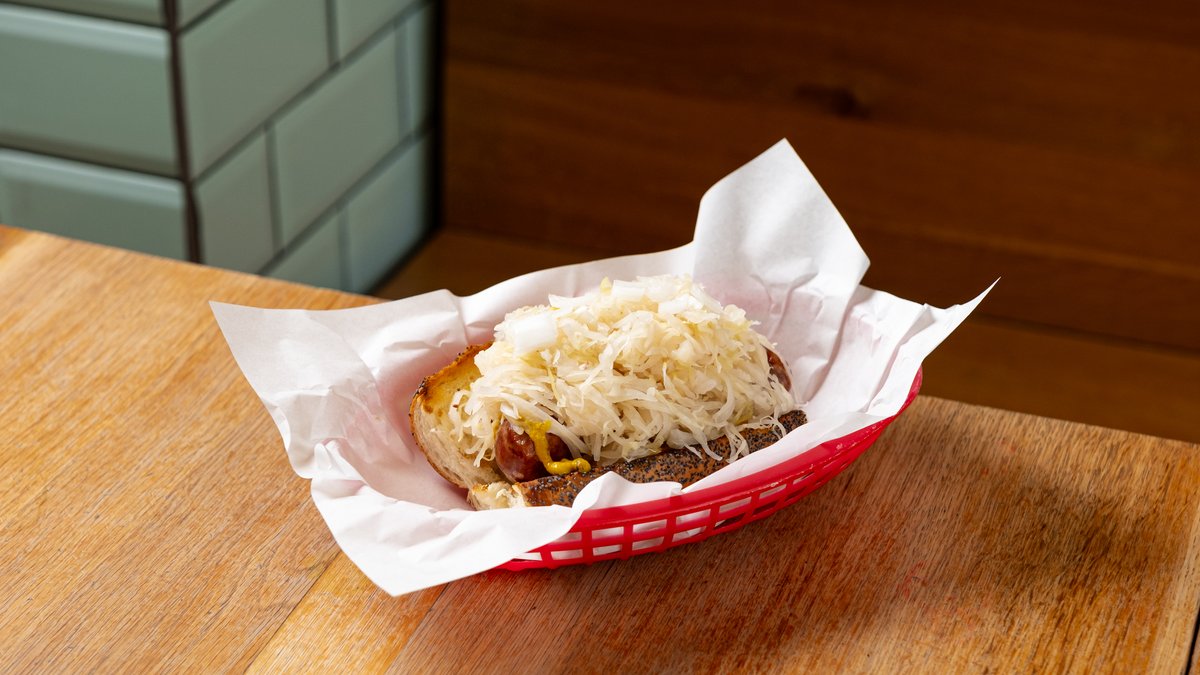 Vepřová klobása andouille, kysané zelí, makový rohlík, grilovaná a čerstvá cibule, deli hořčice