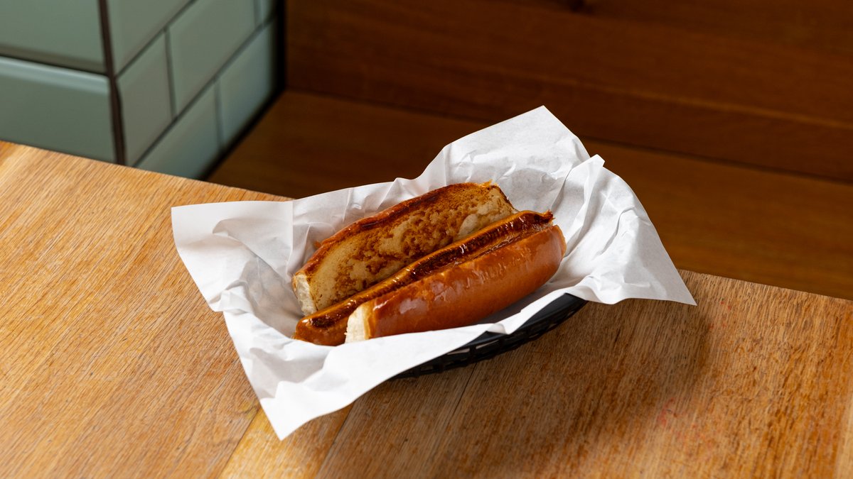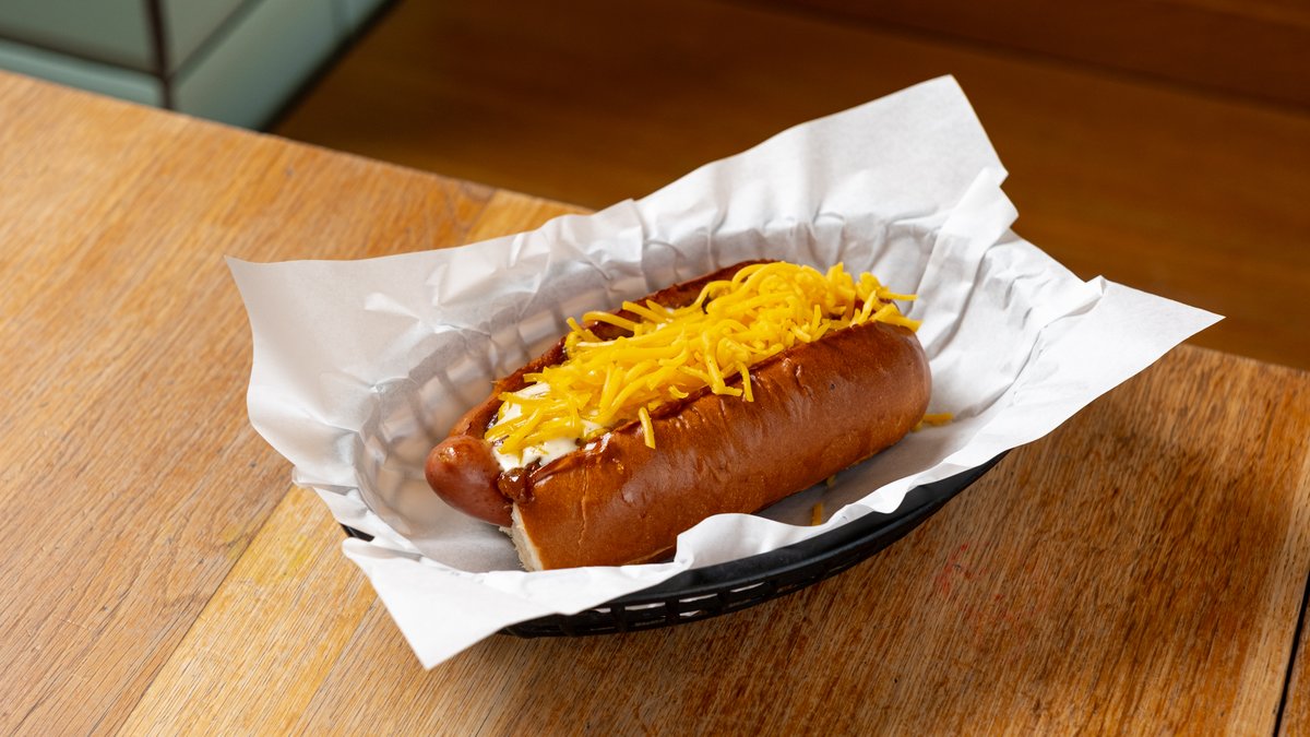 Hovězí párek, slaninový džem, cheddar, sýrová omáčka, deli hořčice