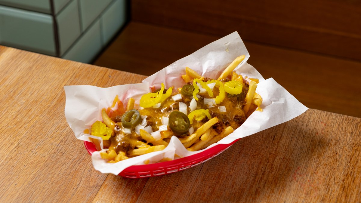 Hranolky, hovězí chili s fazolemi, rozpečený cheddar, cibule, jalapeño, banana papričky