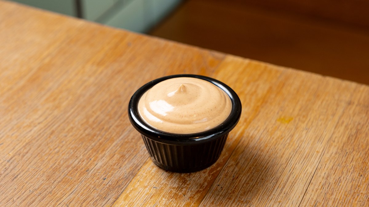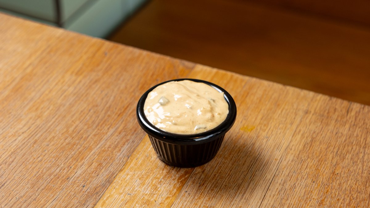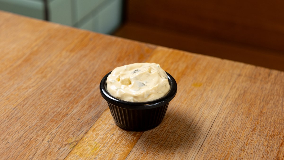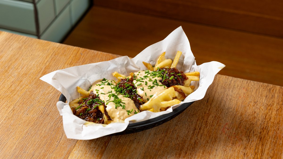 Hranolky, karamelizovaná cibule se slaninou, sýr Monterey Jack, louisianská remuláda, pažitka