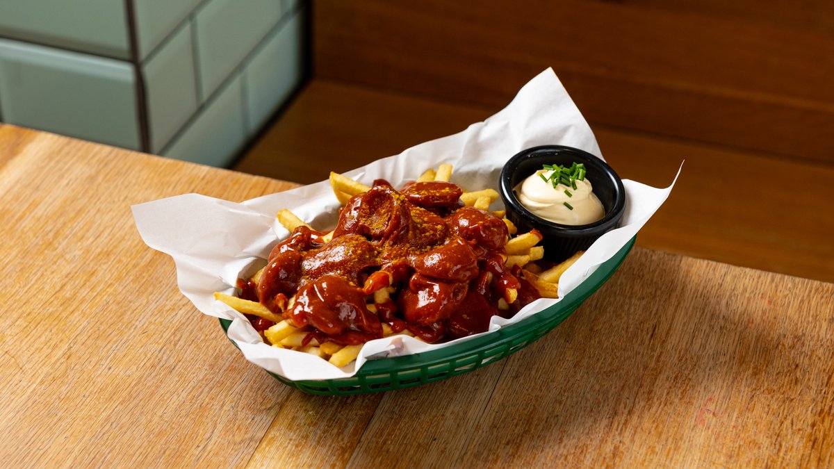 Hranolky, grilovaná andouille klobása, curry koření, curry kečup, majonéza