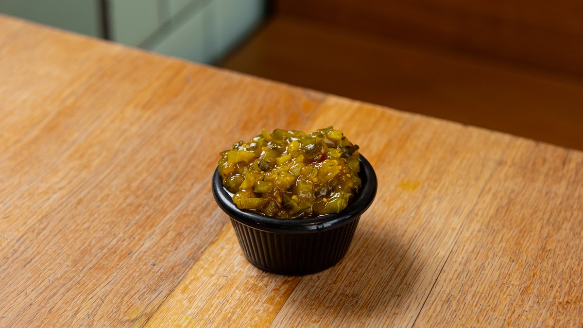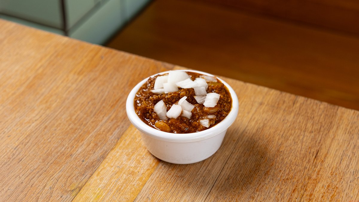 Vepřová klobása southwest, hovězí chili s fazolemi, rozpečený cheddar, cibule