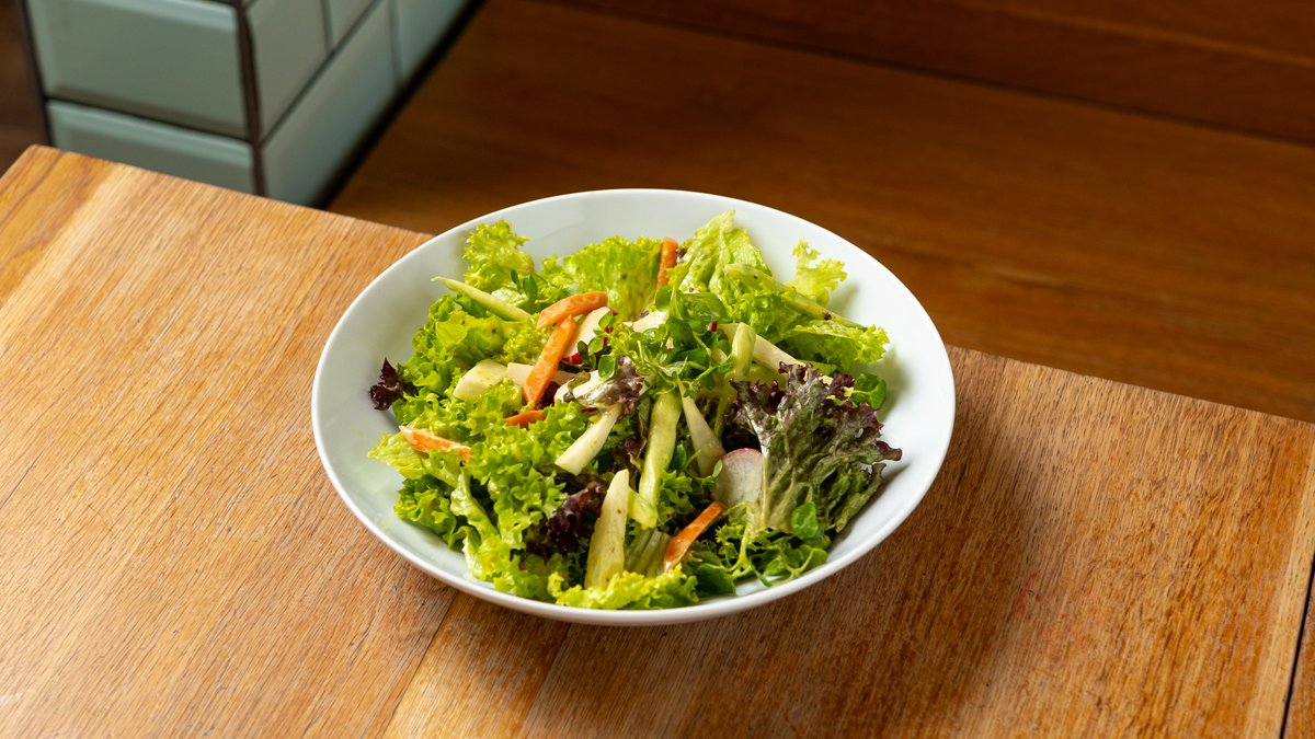 Listové saláty, mrkev, bílá ředkev, okurka, hořčicový dressing