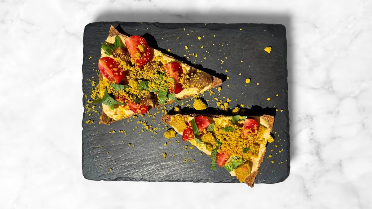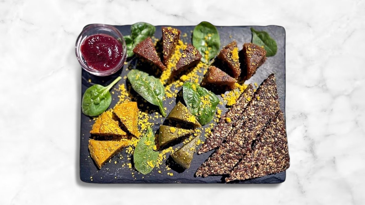 avokádo, paprika, sušená rajčata, rajčata, černá sůl, kurkuma a semínkový raw chléb (celer, mrkev, slunečnicová semínka, dýňová semínka, kari, bylinky, sůl, pepř, tamari, psyllium)