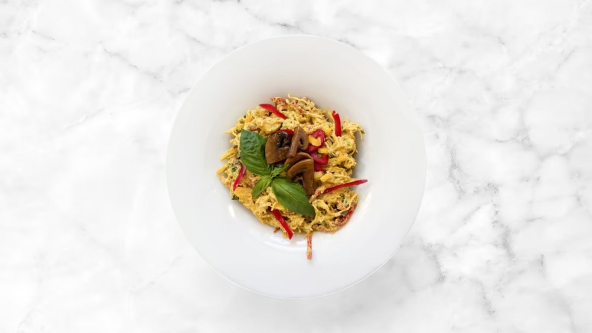 kelpové nudle, paprika, rajčata, žampiony, tamari, olivový olej, datle, česnek, mladý kokos, citrón, chilli, lahůdkové droždí, koriandr, kešu, kari koření, římský kmín, bazalka, oregano, sůl, pepř