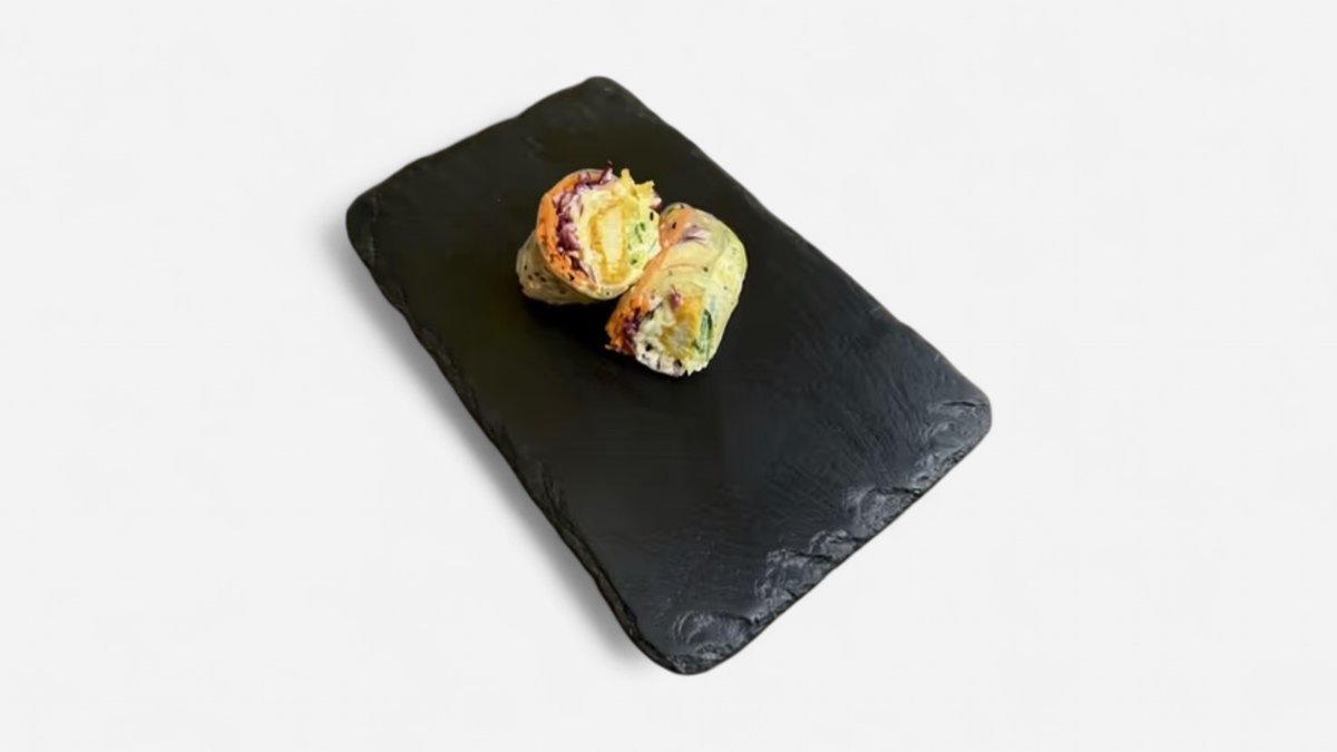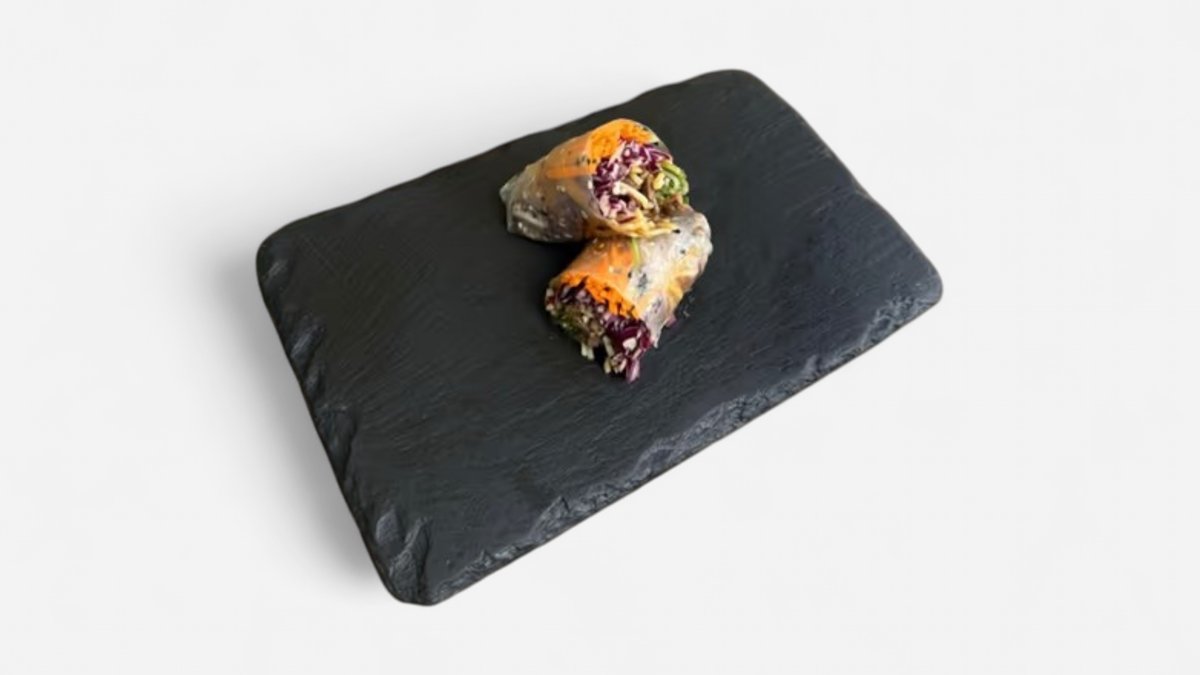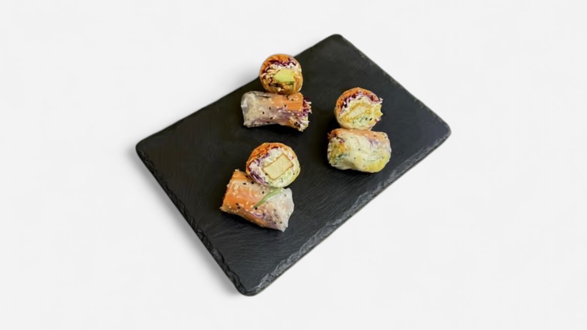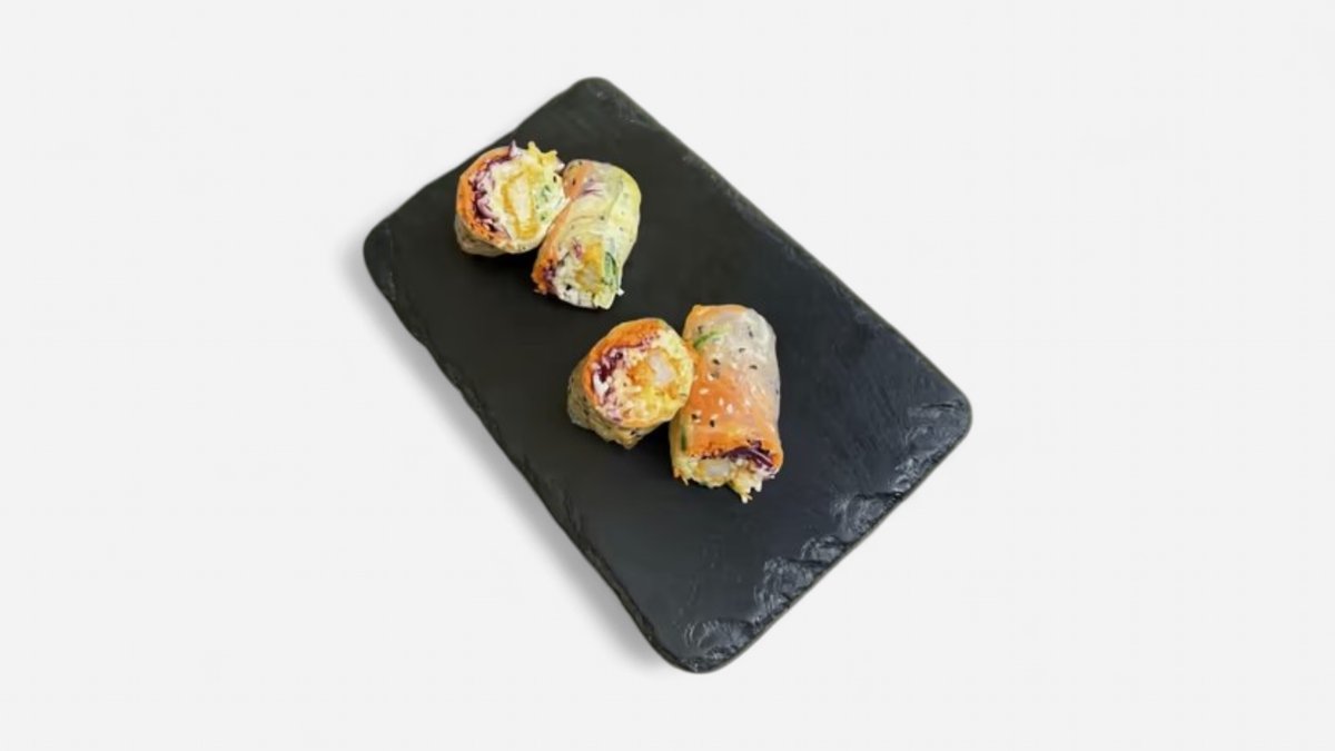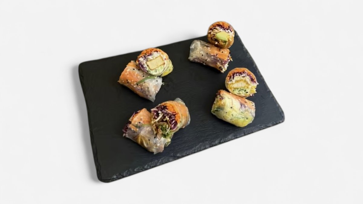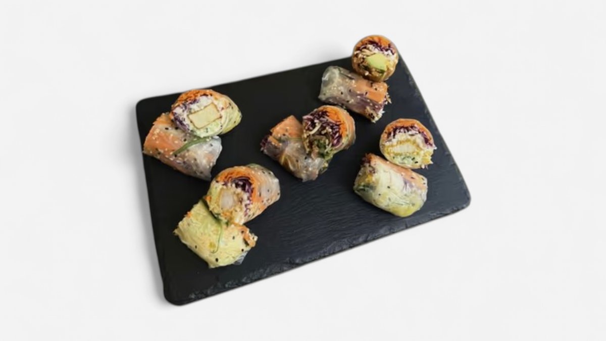 Avocado, rice noodles, cucumber, mango, cabbage, carrot, tomato pesto, pineapple.