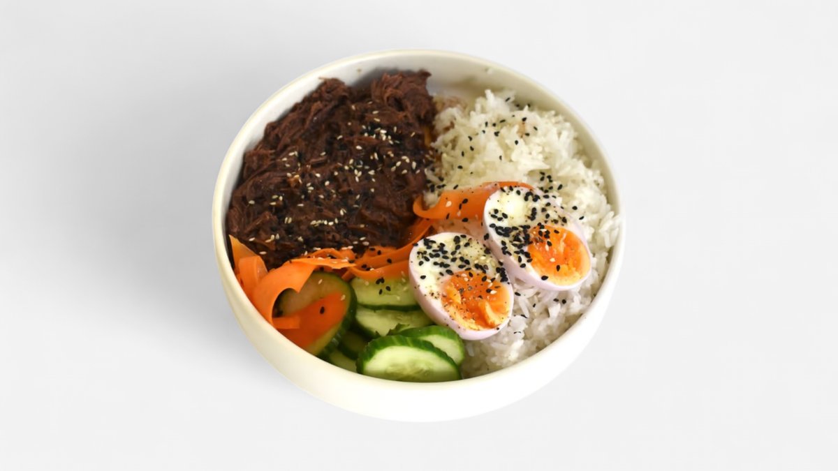 Pulled beef, jasmine rice, vegetables, marinated egg, homemade bulgogi sauce.