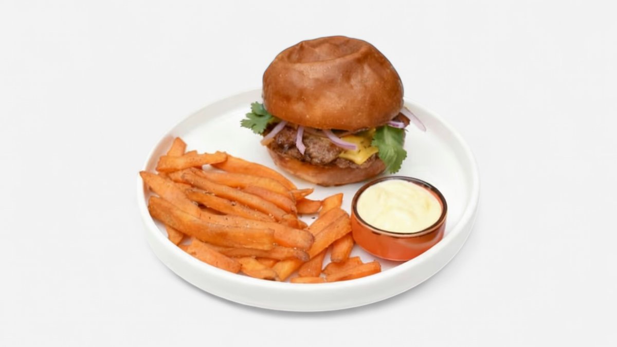 2x 80g beef + pork smashed patty, nuoc mam mayonnaise, coriander, thai basil, lemon grass, shallots, cheddar and sweet potato fries with wasabi mayonnaise.
