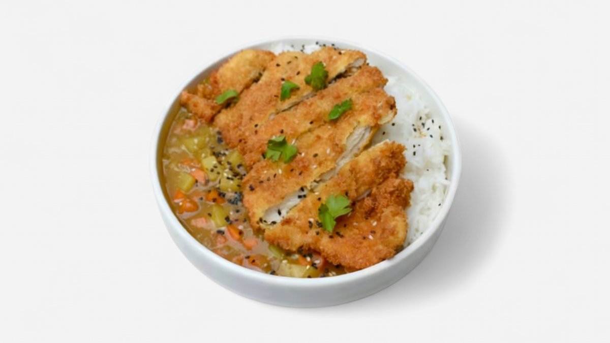 Chicken coated in panko, jasmine rice, japanese curry sauce, vegetables.